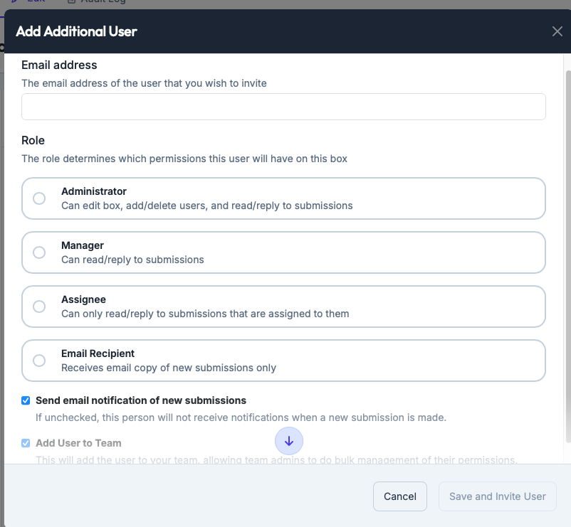 You can also choose whether to add them to your Team here. If you leave it checked, that person will automatically be added to your Team as a member and you will be able to handle permissions and access across multiple boxes in the Teams section.